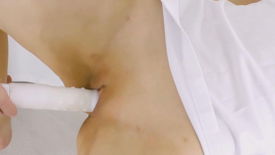 机の上でまんぐり。両膝を腕で抱えおまんこぱっくり状態。そこへバイブ∩でズコズコ。挿入部分のアップ。ビラビラがディルドと共に膣内へ巻き込まれる。単調にズコズコ突かれる。吐息を漏らしながら感じて、感じて、超感じまくるかれんちゃん。