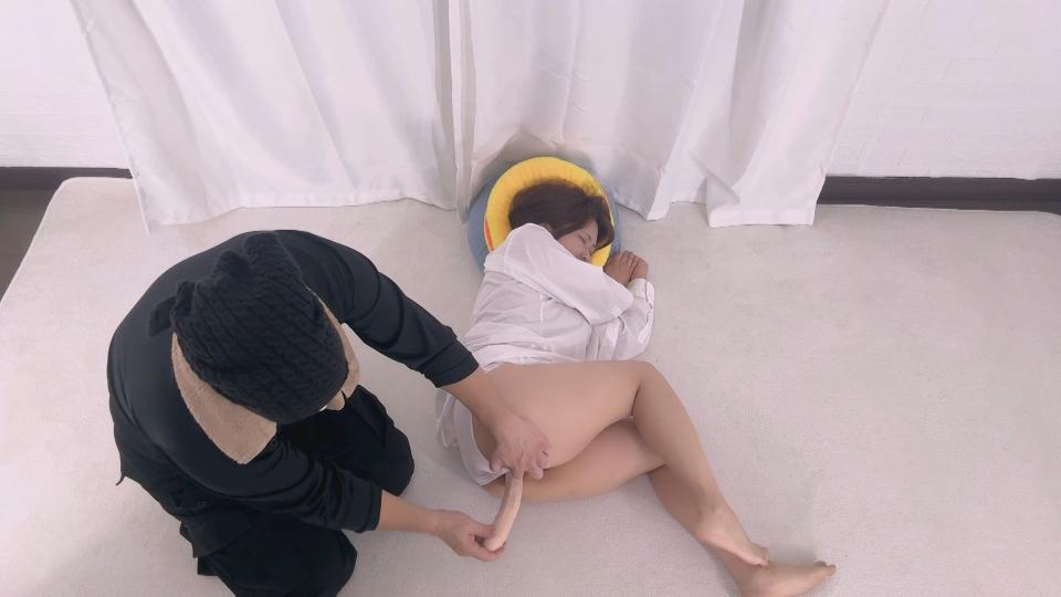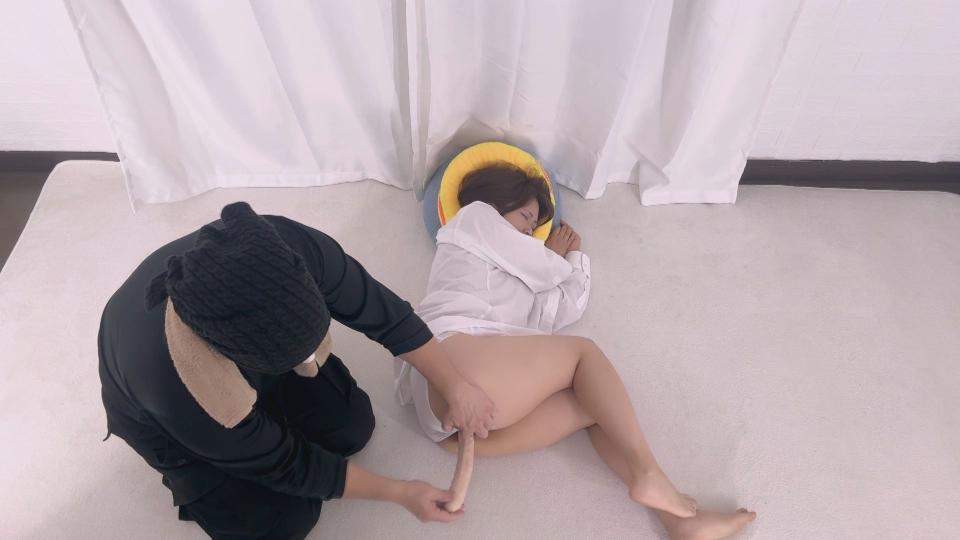 直腸検査のように足を「くの字」に曲げて横たわるまゆちゃん。太めの双頭ディルドでまゆちゃんのお股をグリグリ。そしてパンツを横にずらしてまんこを露わにすると汁でぬるぬるになったまゆちゃんのおまんこにズブッと突っ込む。ズコズコと双頭ディルドを動かしているとまゆちゃんの口からは吐息から喘ぎが漏れ始める。更にパンツを脱がしてズコズコ。締まったおまんことディルドの透き間からはまゆちゃんのスケベー汁がタラッタラと滴り落ちる。